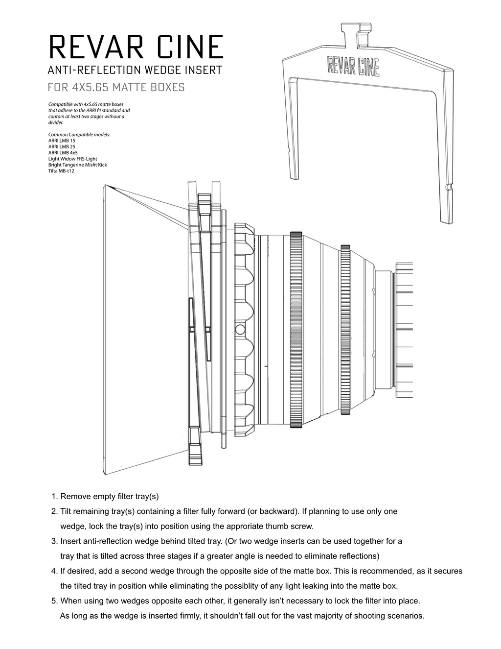 This 4x5.65 width tray wedge fits all common industry standard matte boxes including Bright Tangerine, Arri, Chrosziel and many more.