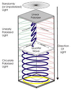 If you add another plate of material going the opposite direction of the linear polarizer, known as a Quarter Wave Plate, the light goes from a linear up and down pattern to a corkscrew-like circular pattern. This is known as a Circular Polarizer.